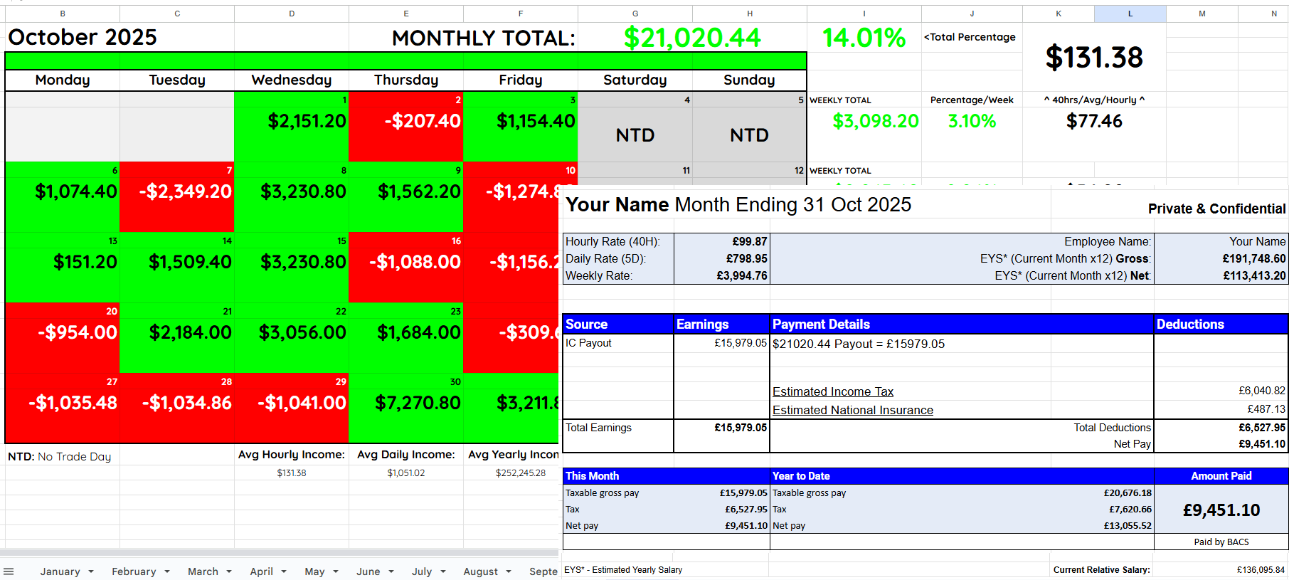 Get instant access to our special PnL Tracker Spreadsheet! Easily track your daily profits and losses from January to December, with automatic weekly and monthly return calculations. Use the Payslip tab to log your payouts, monitor earnings, and manage taxes effortlessly—all in one simple, easy-to-use spreadsheet designed to keep your trading organized and professional.
